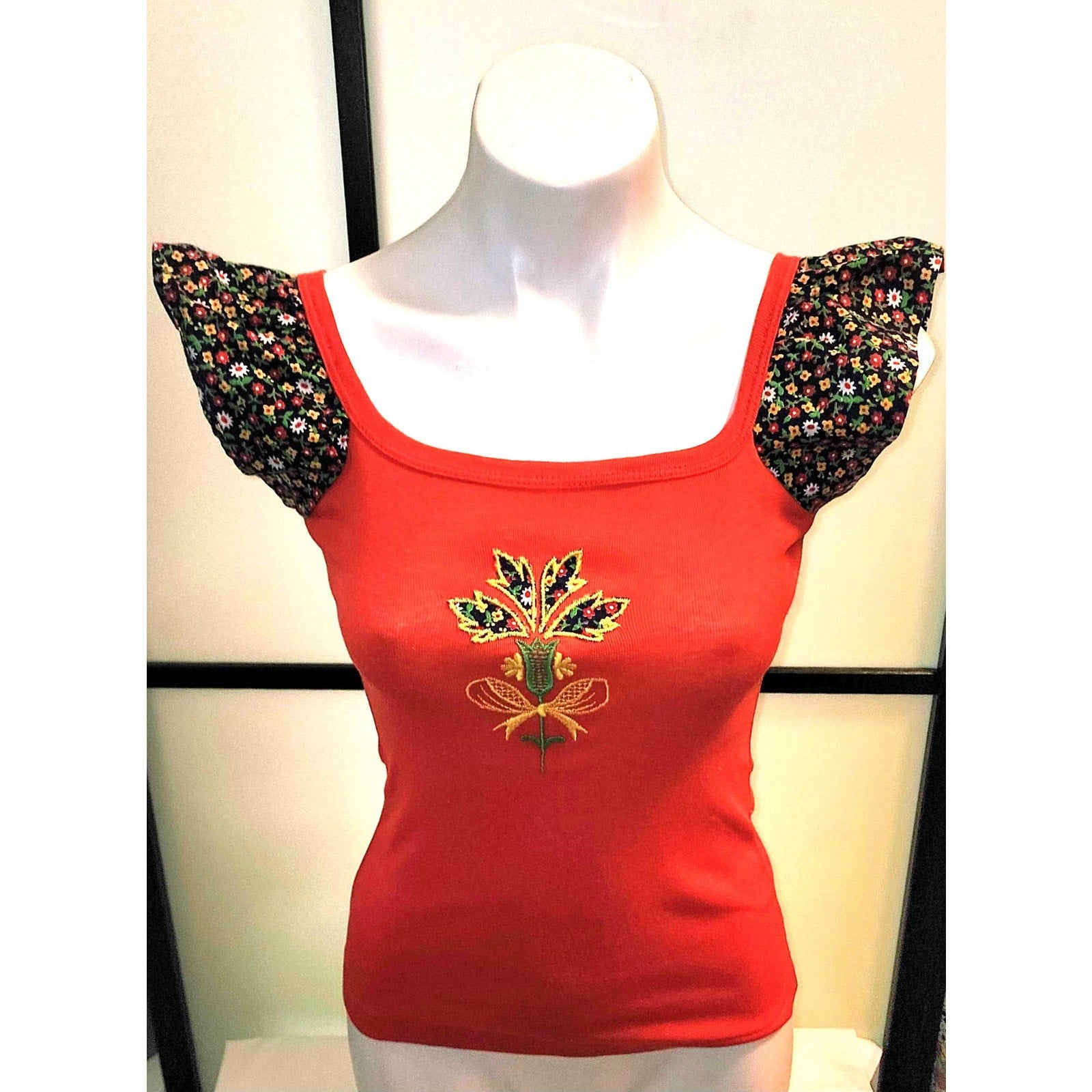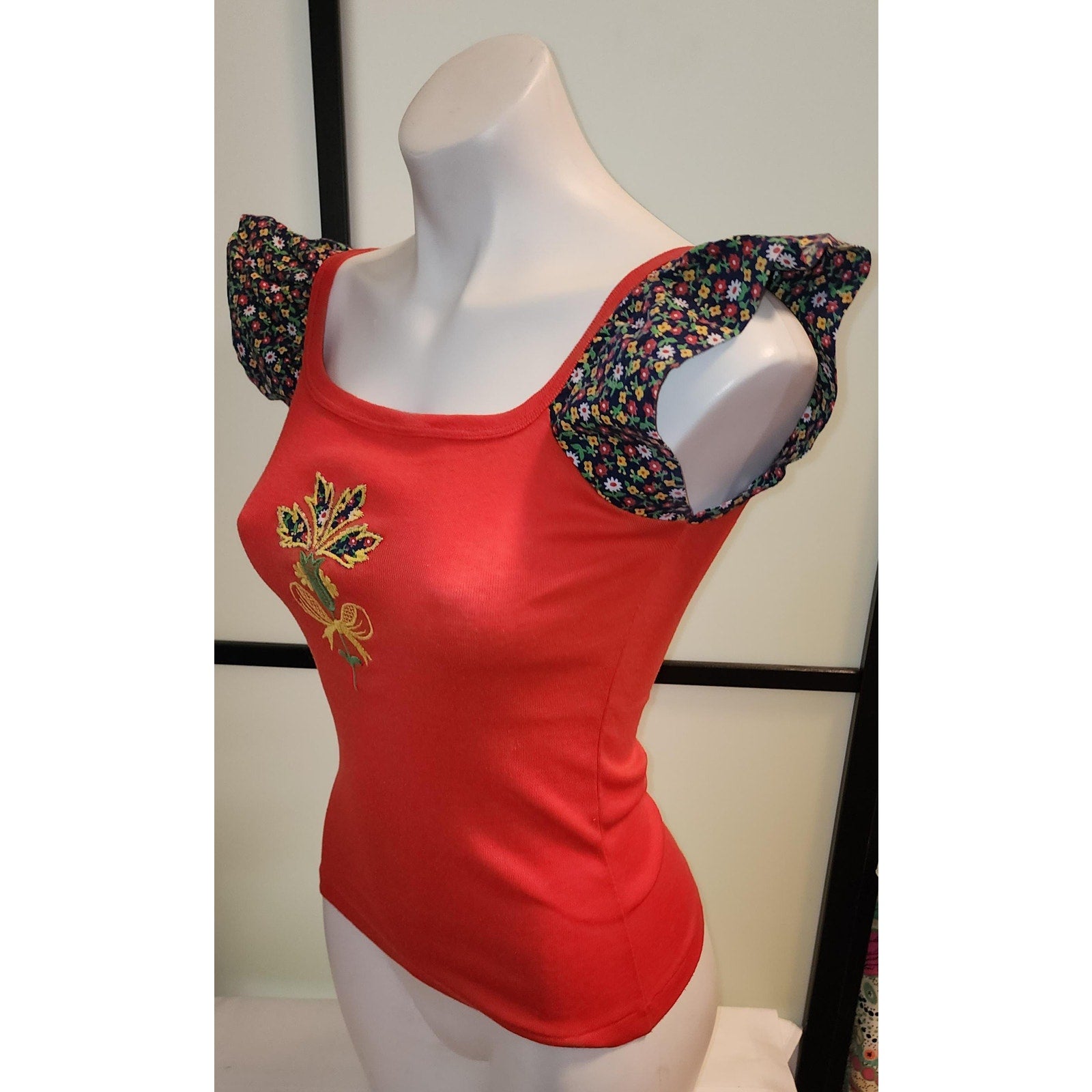 Cute 1970s flutter sleeve top red is brighter than in photos. SIZE S, chest to 34 inches. Made of a stretchy cotton / polyester blend ribbed fabric. Small flutter sleeves of a bright colored tiny floral print fabric. Large embroidered floral design on front with inserts of the same floral fabric. Pulls on over head. Fabric tag inside reads Variety, 50% cotton, 50% polyester, S. In overall good condition. - small yellowish spot on front left side that doesn't show in photos.