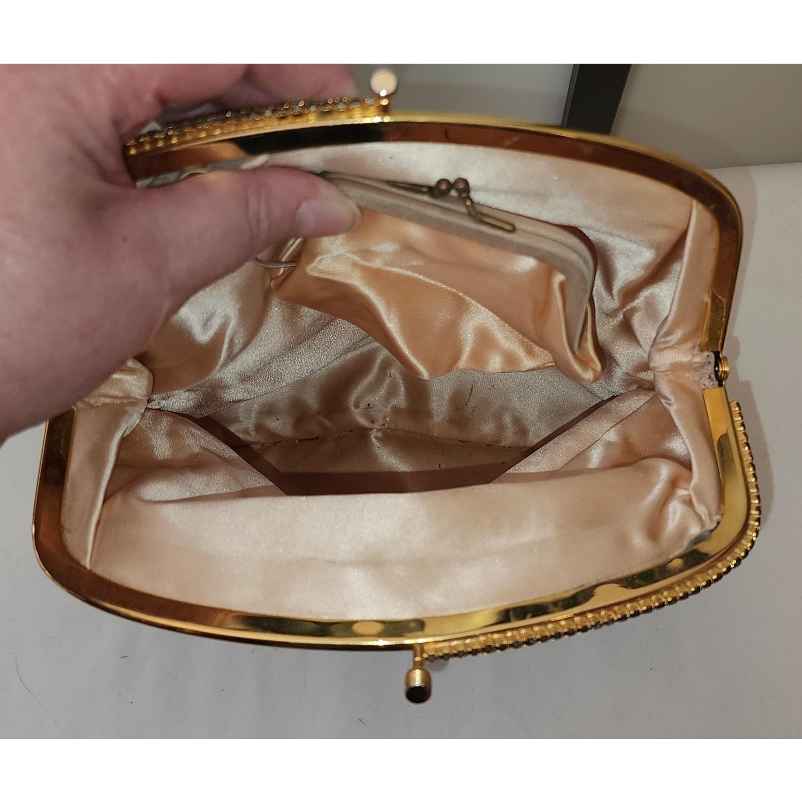 Wonderful small black clutch purse with rhinestone frame, probably 1950s. Made of satiny fabric. Goldtone metal frame with half rows of rhinestones, center kiss lock. Inside lined with beige satin, tiny coin purse attached with elastic cord. No tags or labels. In good pre-owned vintage condition.. ***Photos taken with and without flash***