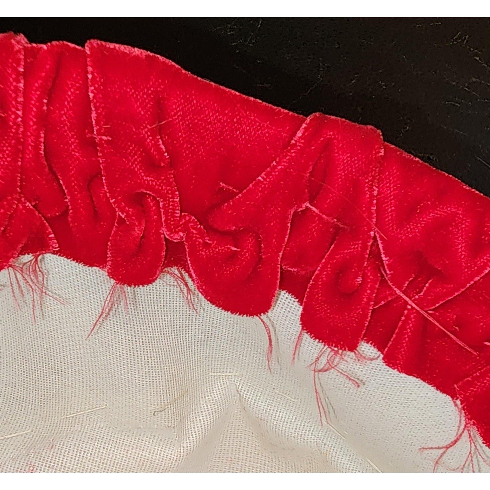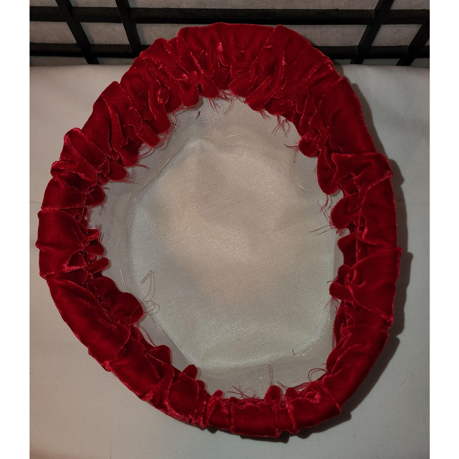 Wonderful 1950s 60s velvet pillbox hat. SIZE 21 inches. Handmade and rough inside (see last photo), with a stiff net base covered in soft bright red pleated rayon velvet. Covered wire around edge. Unlined, no tags. In good pre-owned vintage condition, could use a bit of reshaping due to storage. ***Photos taken with and without flash***