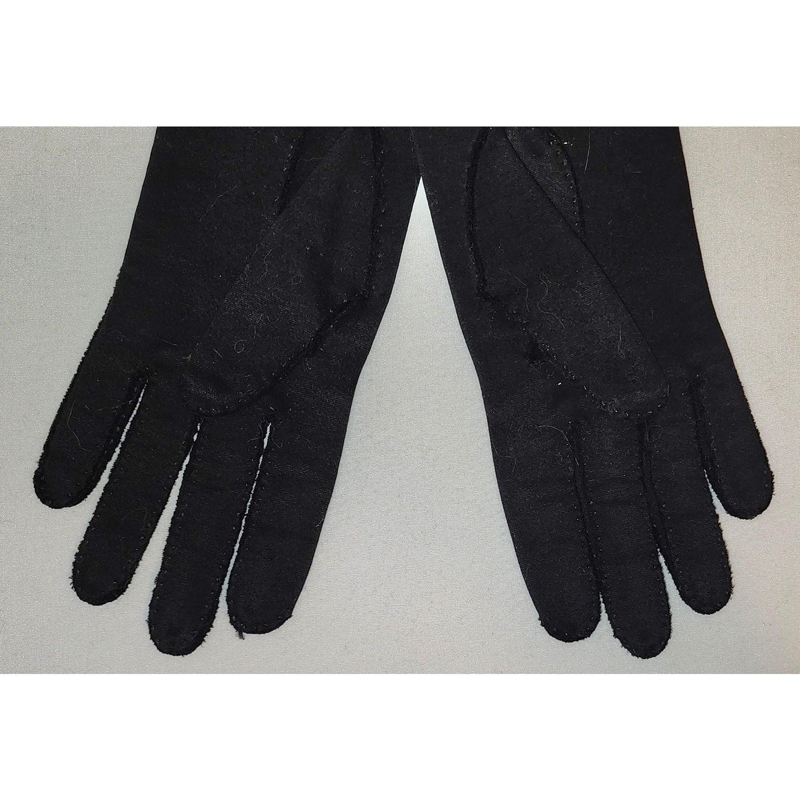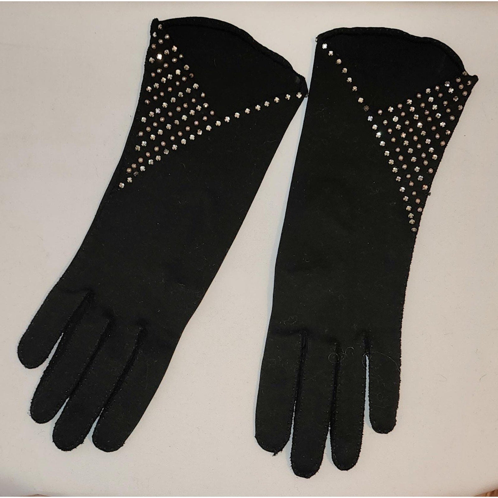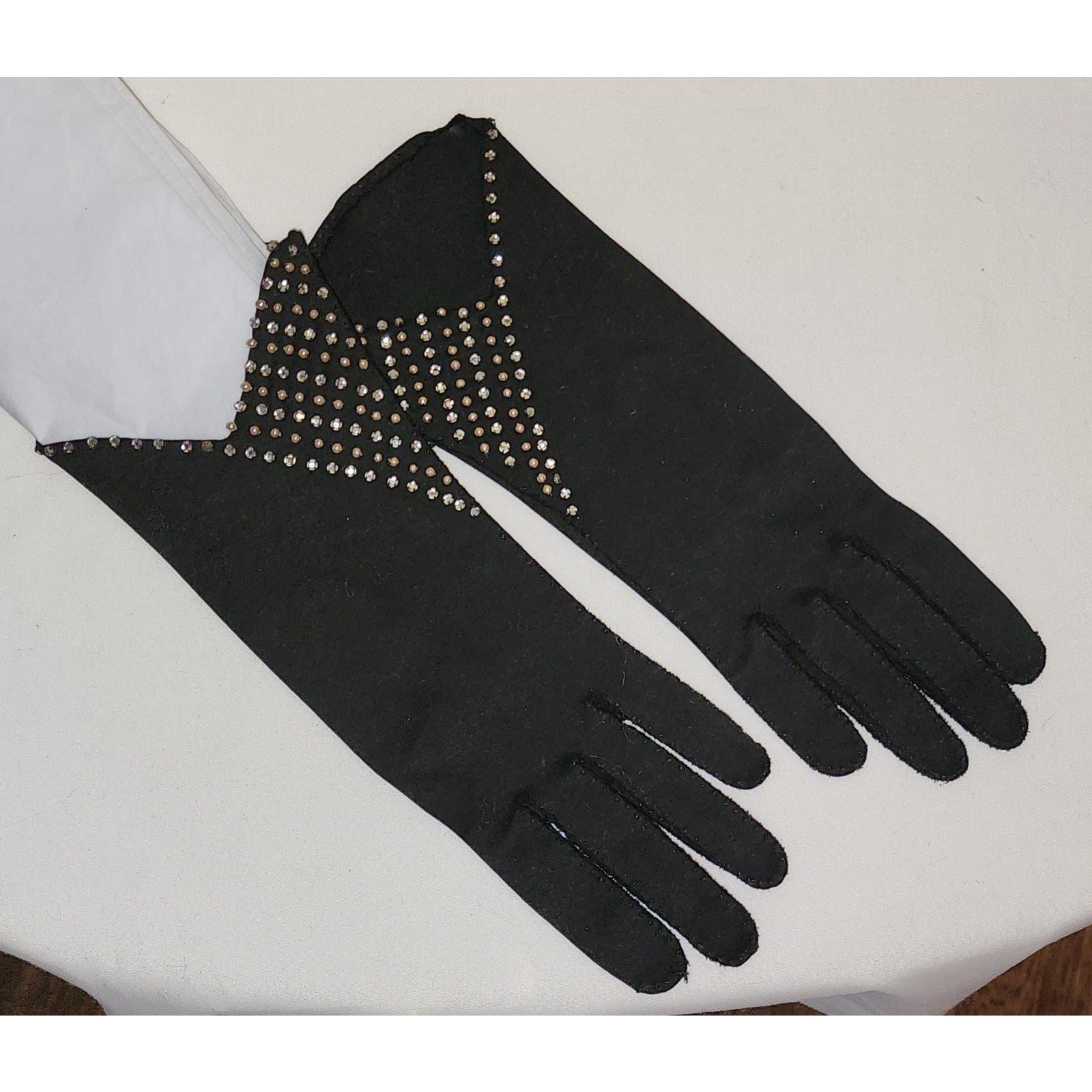 Amazing black midlength gloves with rhinestones and pearls, probably 1950s. SIZE 6 1/2. Made of soft black fabric. Deep cut Vs on tops with geometric design of tiny prong set rhinestones and faux pearls. Should end a few inches above wrist. Unlined. Stamped inside is Elvette by dawnelle, small fabric tag says this too. Small paper tag inside as well. In good pre-owned vintage condition. ***Photos taken with and without flash***