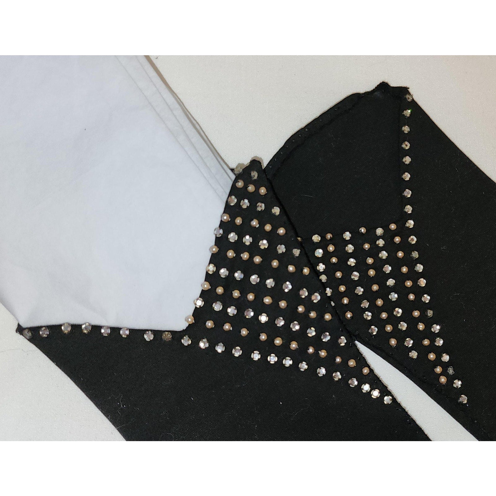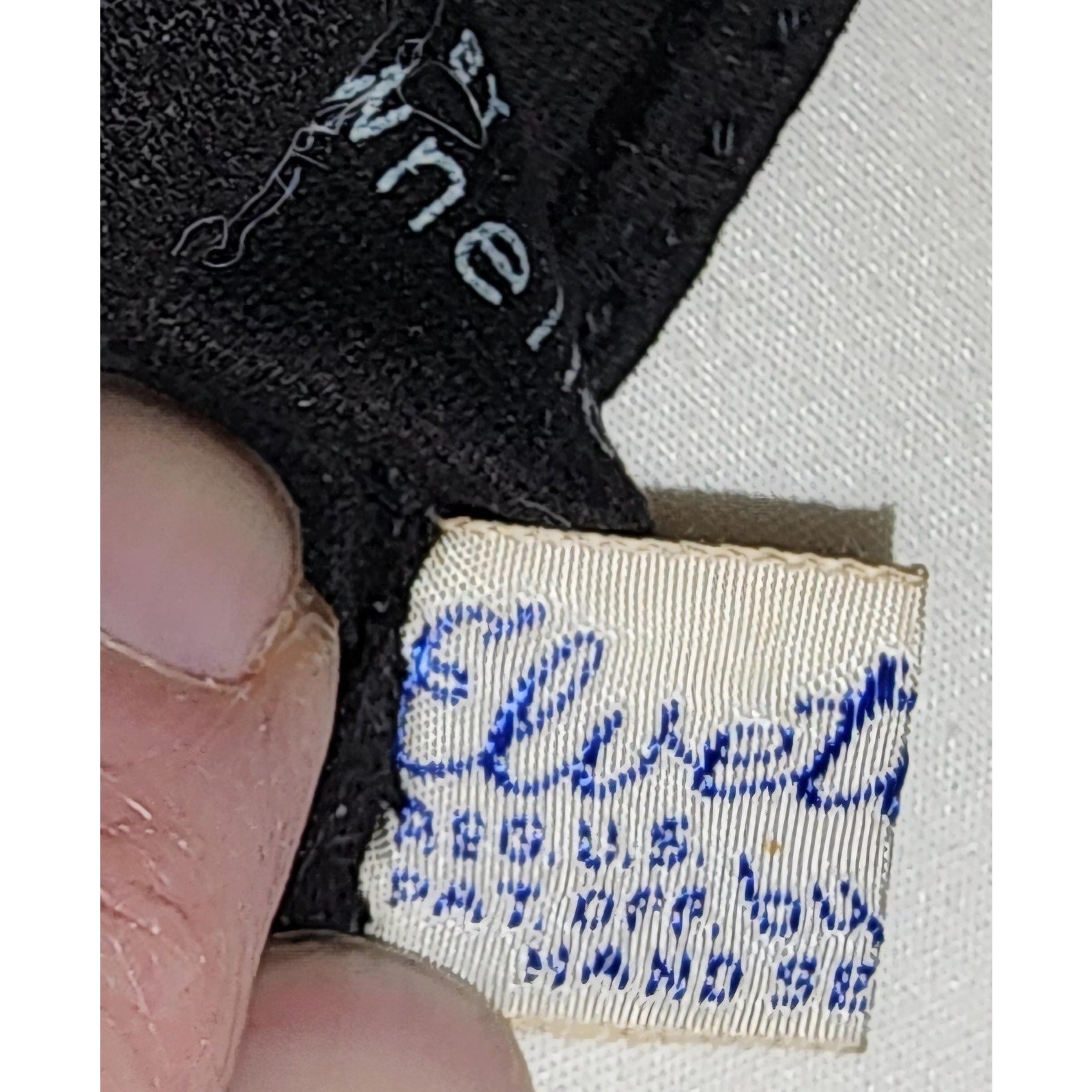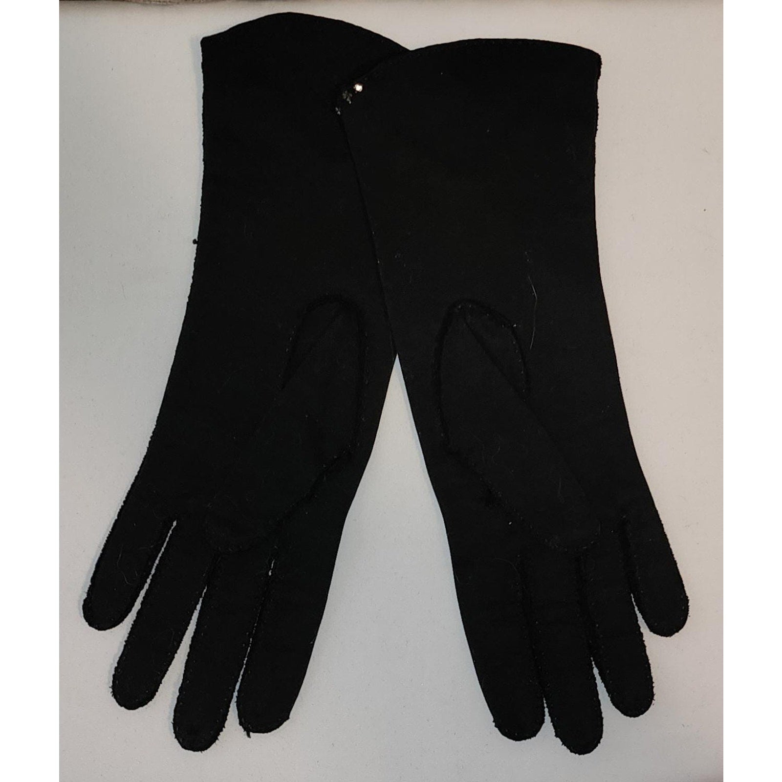 Amazing black midlength gloves with rhinestones and pearls, probably 1950s. SIZE 6 1/2. Made of soft black fabric. Deep cut Vs on tops with geometric design of tiny prong set rhinestones and faux pearls. Should end a few inches above wrist. Unlined. Stamped inside is Elvette by dawnelle, small fabric tag says this too. Small paper tag inside as well. In good pre-owned vintage condition. ***Photos taken with and without flash***