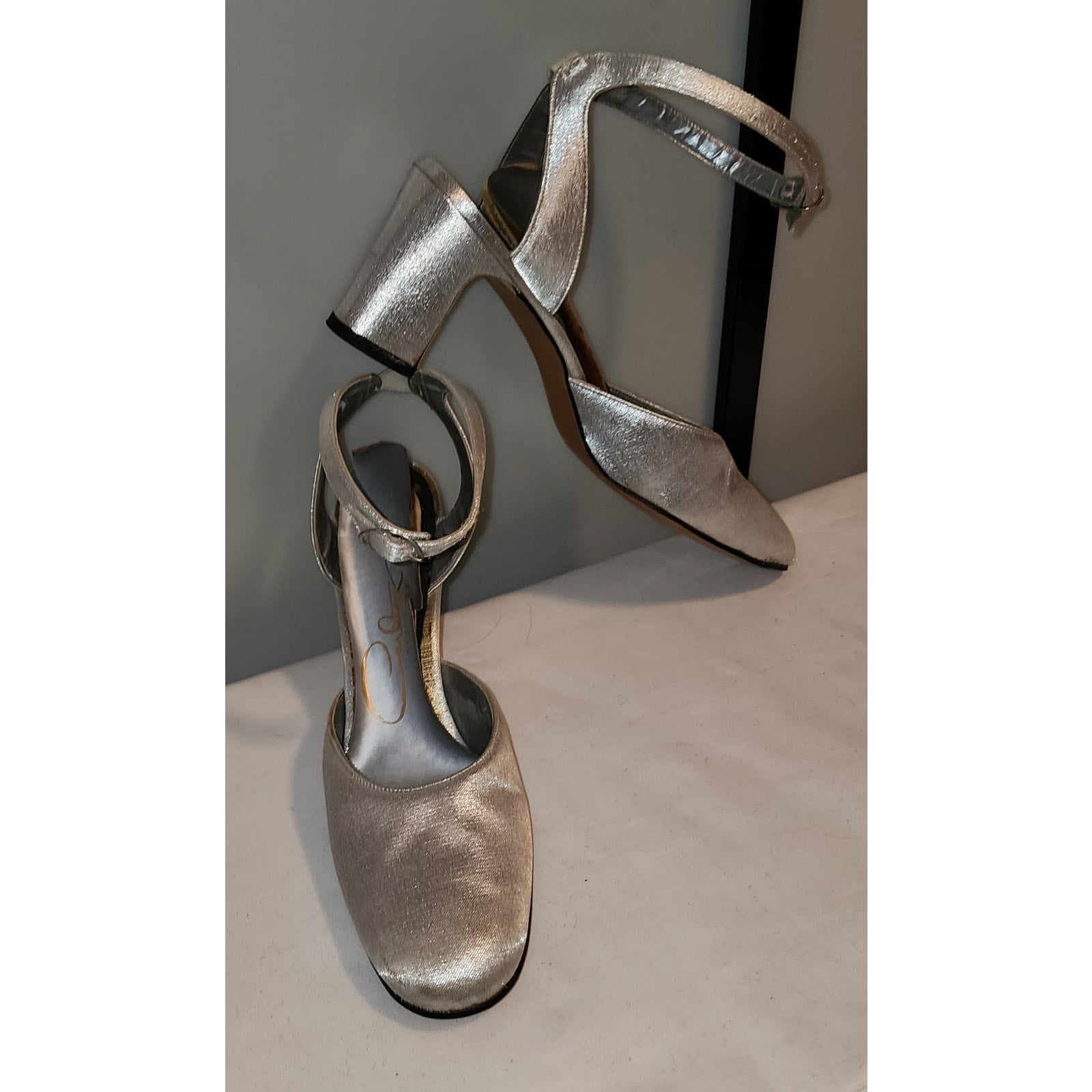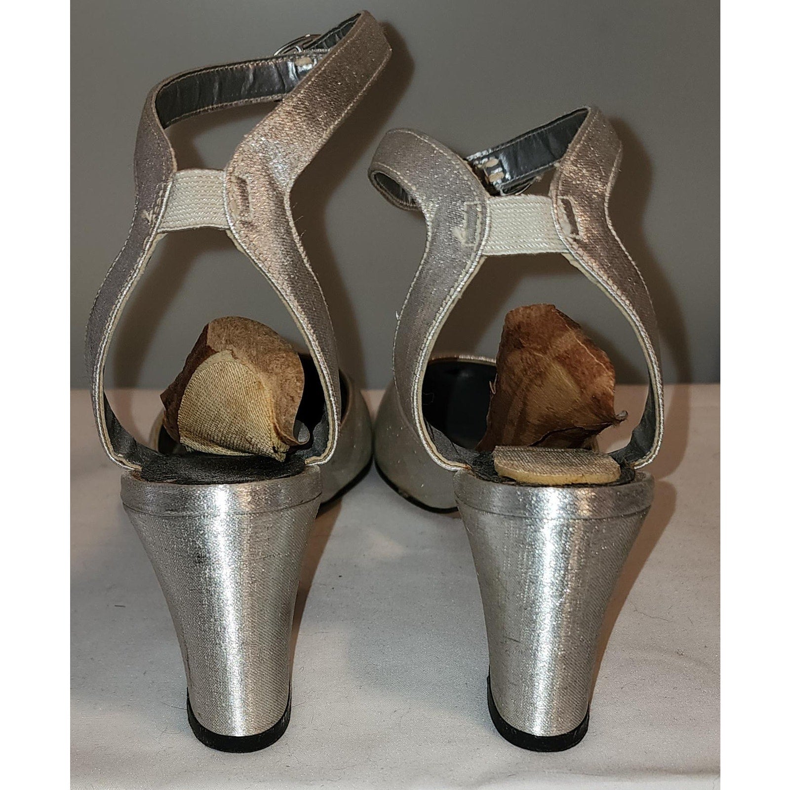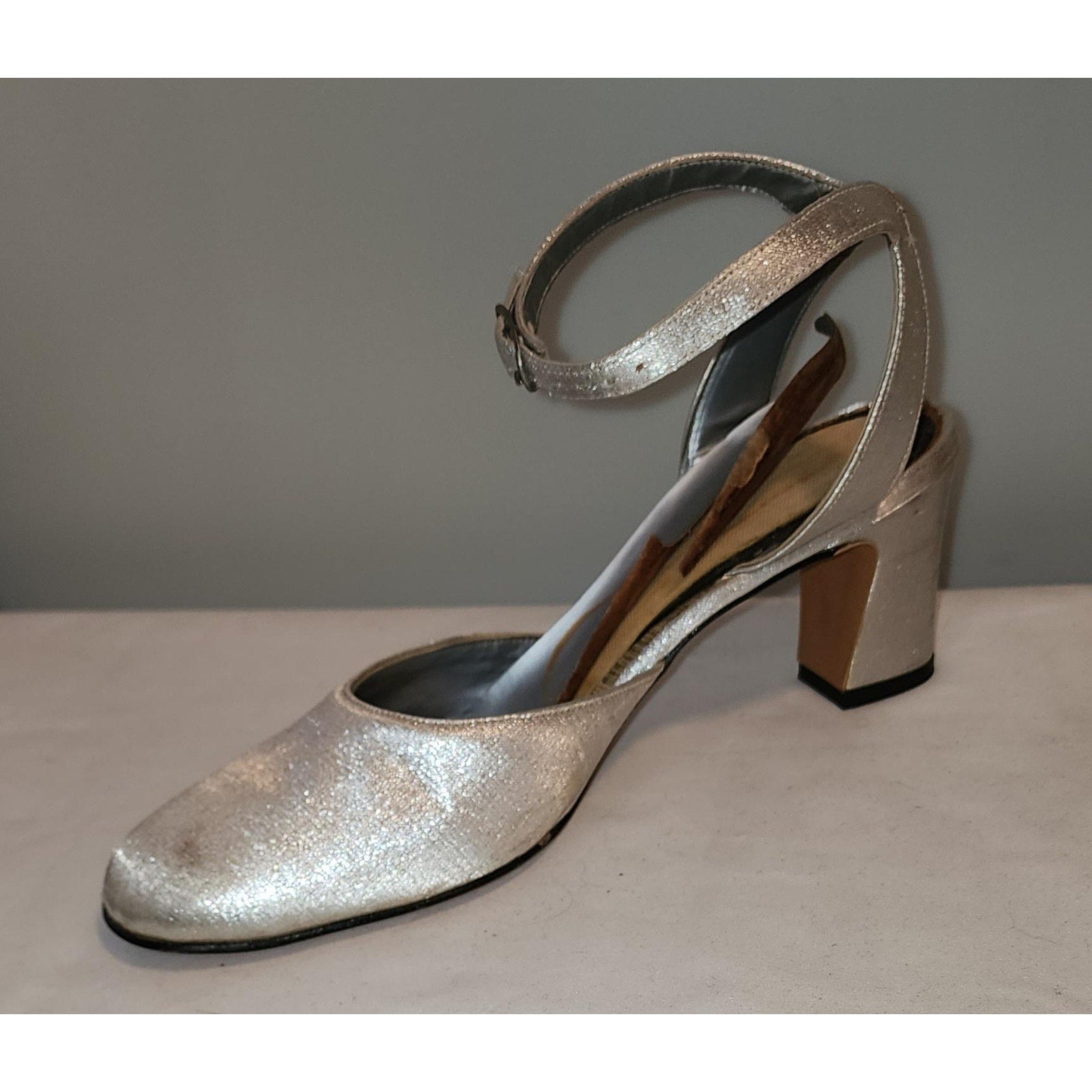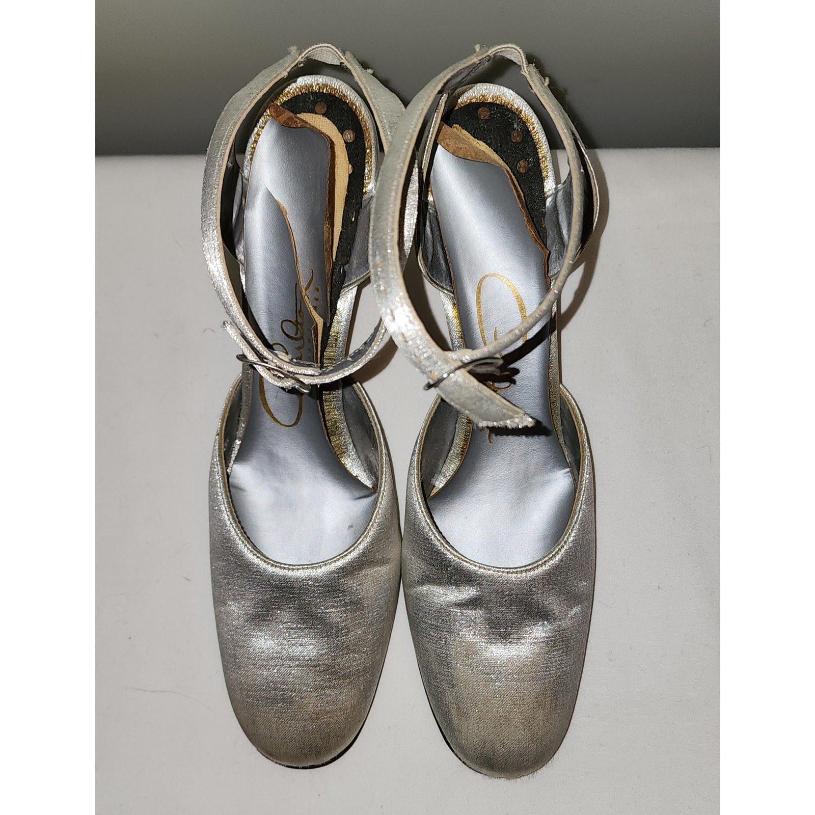 Ultra cool 1960s metallic silver ankle strap heels. SIZE can't find any, measure inside 9.75 x 2.75 inches, heels just over 2.5 inches high. Covered with thin silver lame fabric. Round toes, thin ankle straps with small silver metal buckles. Small square heels. Inside lining paper / thin cardboard is curling up and needs to be replaced, one is cracked. Some light stains and marks on toes. ***Photos taken with and without flash***
