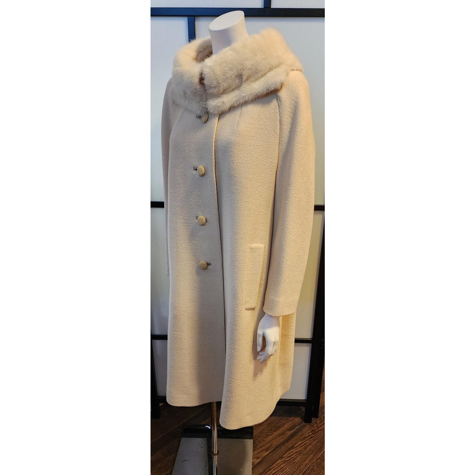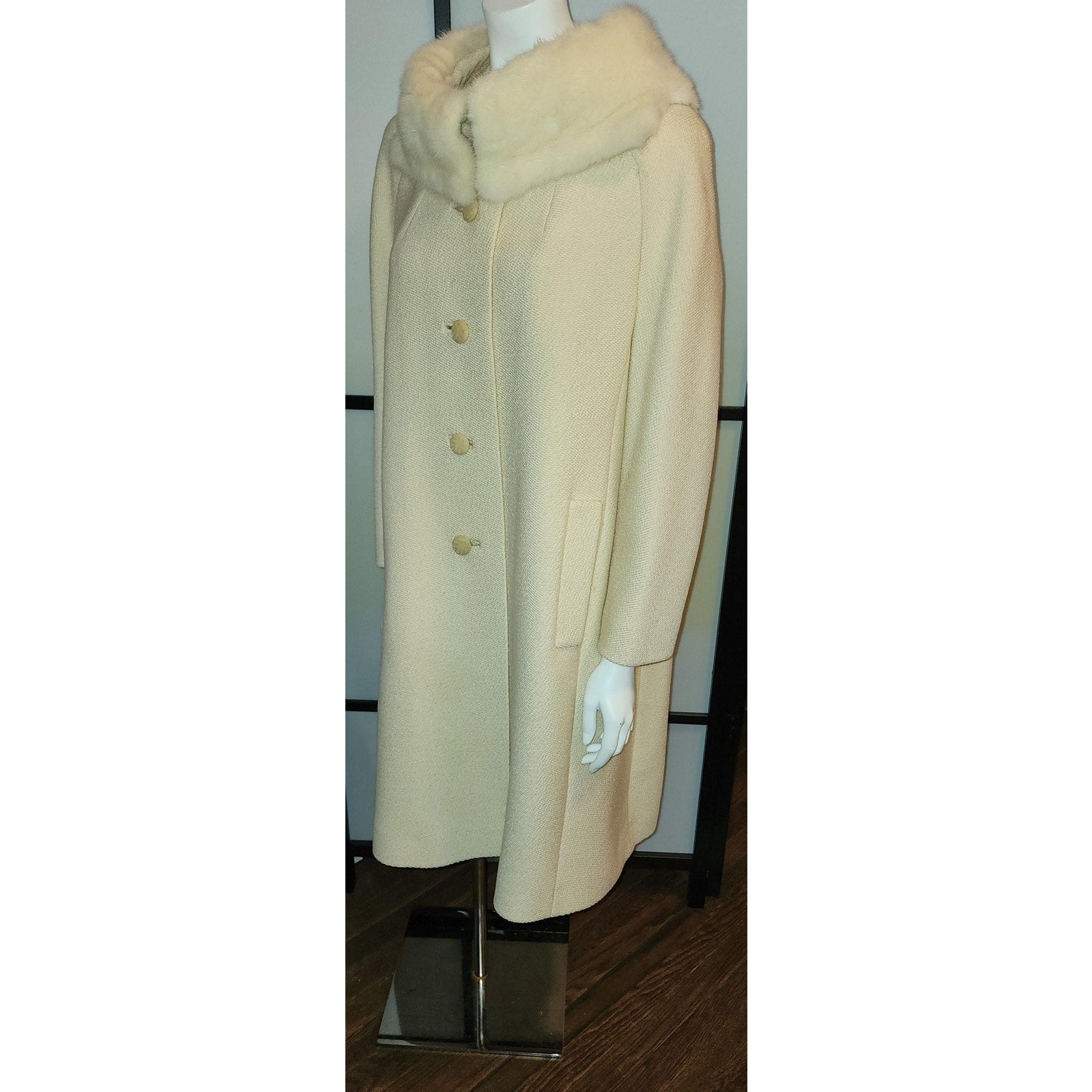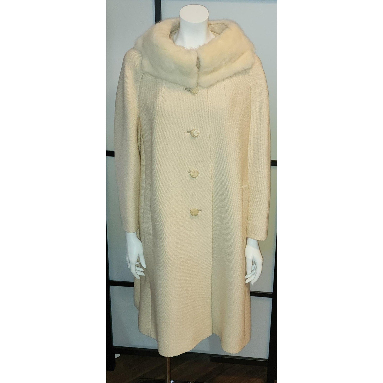 Gorgeous and classic vanilla wool coat, 1960s. SIZE L, chest to 42 inches (please allow room for clothing underneath). Made of woven wool. Large collar of cream mink fur. Large plastic buttons down front. Pockets at sides. Lined with cream satin. Fabric tag inside reads Rothmoor. In good pre-owned vintage condition. ***Photos taken with and without flash.***
